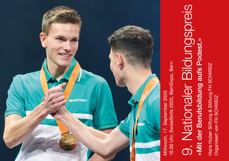 Am Mittwoch, 17. September 2025 um 16.00 Uhr findet in der BERNEXPO in Bern die Verleihung des 9. Nationalen Bildungspreises statt. In diesem Jahr findet die Preisverleihung erstmals im Rahmen der SwissSkills 2025 statt – der bedeutendsten Leistungsschau der Schweizer Berufsbildung. Unter dem Motto «Mit Berufsbildung aufs Podest.» feiern wir Unternehmen, die sich in besonderer Weise für die duale Berufsbildung engagieren und damit einen wertvollen Beitrag zur Zukunft der Schweizer Wirtschaft leisten. Ausgezeichnet wird jährlich ein Betrieb, der sich mit beispielhaftem Einsatz für die Förderung junger Berufsleute starkmacht. Der Nationale Bildungspreis wird von der Hans Huber Stiftung und der Stiftung FH SCHWEIZ vergeben. Die Organisation der Veranstaltung übernimmt FH SCHWEIZ. Die Teilnahme ist kostenlos.