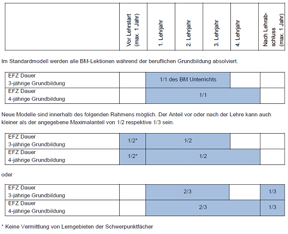 • Eckwert 2: Bis zu einem Drittel des BM-Unterrichts kann bis spätestens ein Jahr nach dem Abschluss der beruflichen Grundbildung und dem Ende des Lehrvertrags besucht werden.