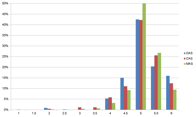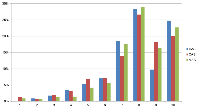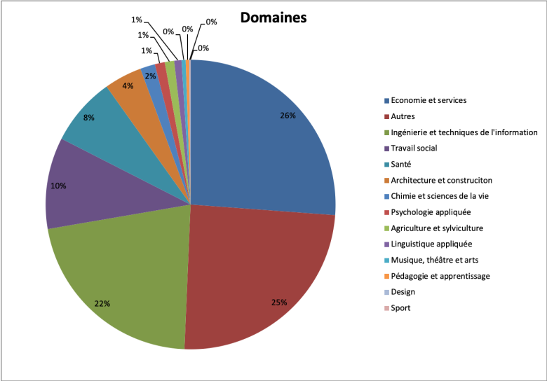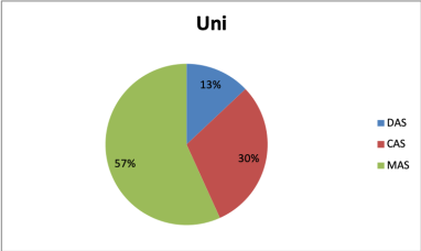 Les 2'591 personnes sondées ont suivi au total 3'616 formations continues (CAS, MAS, DAS), soit 1,4 formation continue par personne. Le CAS obtient la demande la plus élevée, suivi de près par les MAS tandis que la demande des DAS est plus faible. 90% des sondés ont suivi leur formation continue au sein d’une haute école spécialisée. 10%, soit 363 diplômé-e-s HES interrogés ont suivi leur formation continue dans une université. Parmi eux, 57% ont suivi un MAS.