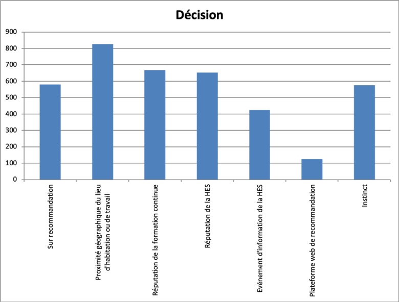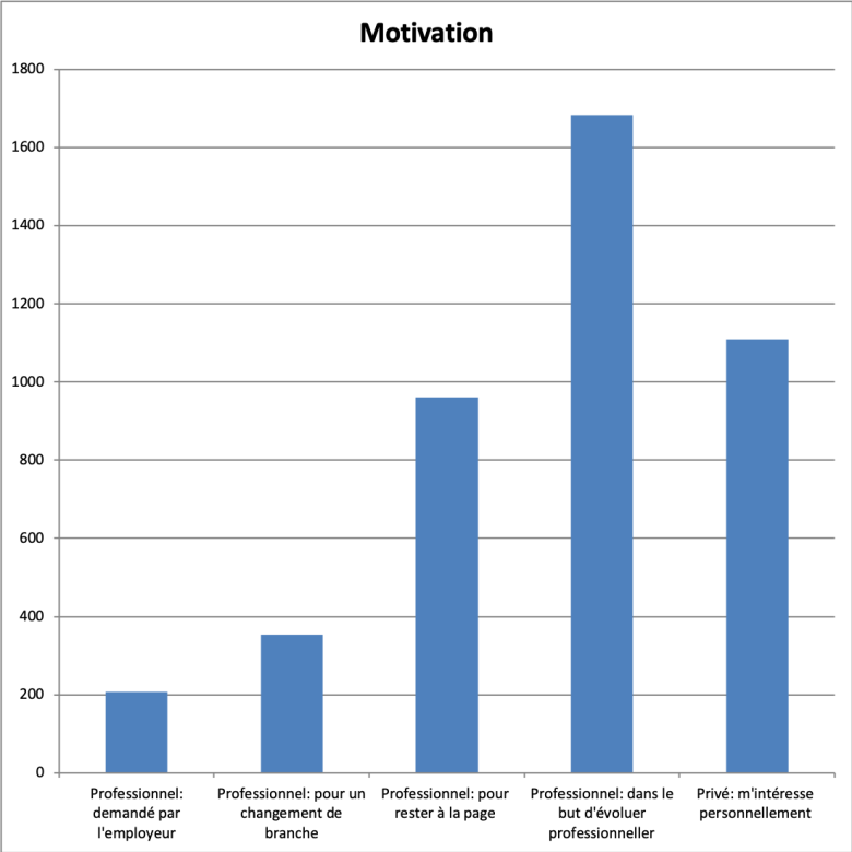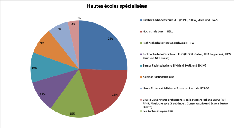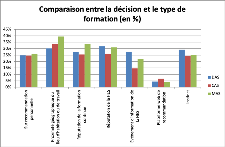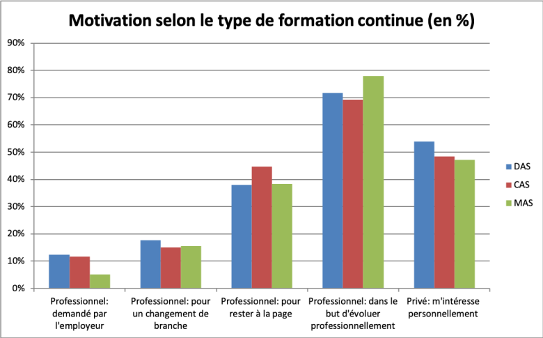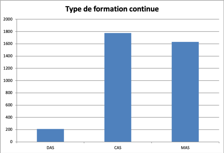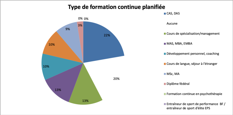 Dans le sondage complet de l’étude sur les salaires HES, 7'288 personnes ont répondu planifier suivre prochainement une formation continue, soit environ 80% des sondés. Les CAS, DAS et MAS font partie des formations planifiées le plus souvent citées dans l’enquête. En second plan se trouvent les cours spécialisés ou de conduite de personnel, suivis de plus loin par la formation continue en développement personnel et en langues Les détenteurs d’un titre de bachelor ou d’un master consécutif choisissent de préférence un CAS comme formation continue tandis que par le passé les diplômés HES se tournaient plus volontiers vers un MAS. Comme confirmé par les Hautes écoles spécialisées, la demande en CAS augmente légèrement consécutivement à une offre grandissante de ce type de formations continues au sein des HES.