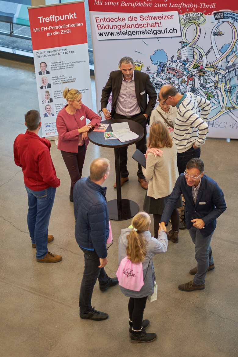 «Steig ein. Steig auf.» will der Dachverband Abhilfe schaffen. Eine Massnahme innerhalb dieses Projektes waren die Rundgänge durch die ZEBI. Ausgewiesene Führungskräfte stellten sich zur Verfügung und beleuchteten auf diesen Rundgängen die Ein- und Aufstiegsmöglichkeiten nach der Berufslehre. Brigitte Breisacher (Geschäftsführerin Alpnach Norm-Schrankelemente), Daniel Salzmann (Geschäftsführer Luzerner Kantonalbank), Stefan Schulthess (Direktor Schifffahrtsgesellschaft des Vierwaldstättersees) und Kurt Bucher (Direktor Human Resources Pilatus Flugzeugwerke) zeigten anhand ihrer Werdegänge die Perspektiven auf.
